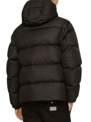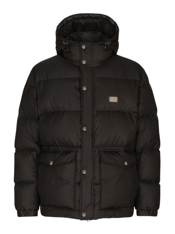 DOLCE & GABBANA giacca imbottita in nylon con cappuccio e placca logo metallica. Il modello presenta una chiusura frontale combinata con zip e bottoni a pressione, due tasche anteriori con pattina, maniche lunghe con polsini elastici e cappuccio regolabile. L’imbottitura in piuma garantisce una struttura compatta e lineare, mentre la placca logo in metallo sul petto aggiunge un tocco distintivo.